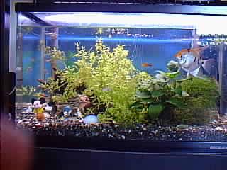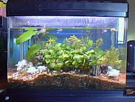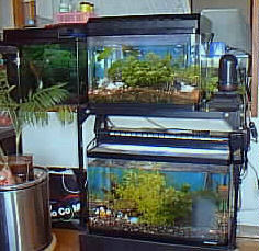 |  | グッピーの水槽(左の写真) 熱帯魚はグッピーから始めました。那須では結構、数が増えたのですが、柏に戻ってきてあまりうまく育たなかったですが、水槽の中の石をかえたり、子ども