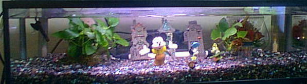 グッピーの子供専用水槽。横60センチ、縦が15センチほどのデスクサイズ水槽。 |