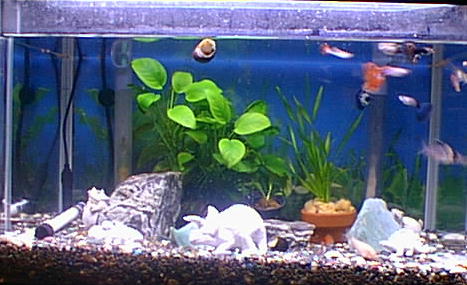 親グッピーの水槽。下は子供専用で、はじめ、水槽1つでやっていると、子供ができると親は割と短命だった。しかし、子供