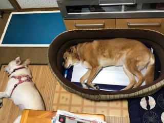 |  | ルビーが避妊手術から帰ってきました。 私はお母さんに入れてもらった冷えひえ板でのんびり。