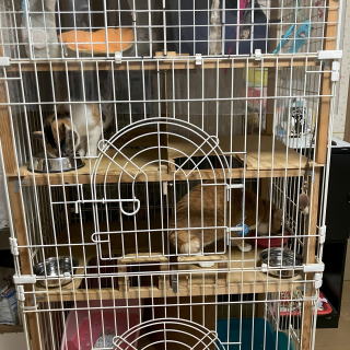 |  | 正月に杏を茶太と同じケージに移しました。しばらくは新しいケージに慣れなくて、ベッドからなかなか出てこなかったのですが、最近は食事の時間に合わせておねだりに出てくるようになりました。茶太と杏が同時に食事中です。 茶太には悪いですが、各階に仕切りを入れたので、広さが半分になりました。が、高さはそのままなので機嫌よく暮らしています。時々、ケージの外に出て走り回っています。