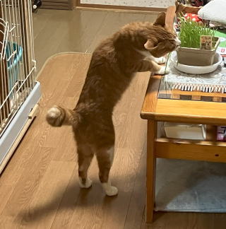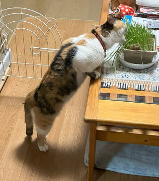 先日、茶太がカーネーションを食べてしまい、茎が喉にひっかかったようで、吐いていました。 吐き後を見ると茎のままのカーネーションが2,3本。 きっと草を食べたいのだということで、ニャンコ用の草を買ってもらい、茶太も杏も早速がっついています。一緒に食べればいいのですが、杏はまだ茶太にシャーを言うので、別々に食事中です。