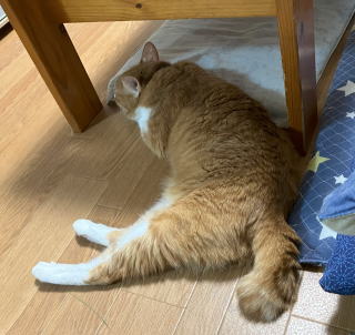 杏は、ケージから抜け出すとテーブルの下で涼んでいることが多いのですが、最近はキッチンの入り口でゴロゴロすることが多くなりました。