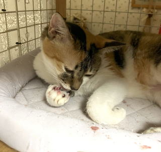 一昨日、右手が痛そうで血が出ていた。捕まえて様子を見ようとしたら、よほど触られたくないのかシャーシャーと左手のねこパンチと嚙みつきで抵抗。今日少し落ち着いたので、捕まえてお医者さんに診てもらったところ、右手の肉球が怪我をしていた。
