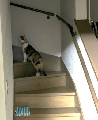 2階に上がりたいが2階が暗いので怖くて登れない杏。