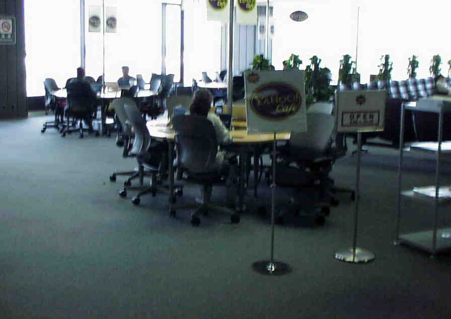 オランダ スキポール空港(2002/5/31) スキポールでは有料(30分:5.9ユーロ)でインターネットが利用できる。写真は国際線のカフェだが、国内線にも同じコーナーがあった。国際線では、 モバイラー用にダイアルアップ用の電話も用意されていた。