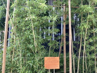 東芝未来科学館前。エジソンが電球に使った京都石清水八幡宮の竹。エジソンは1879年に竹をフィラメントにして、電球の実用化に成功しました。その時に使ったのが、石清水八幡宮境内に生えていた竹です。石清水八幡宮から移植した竹です。