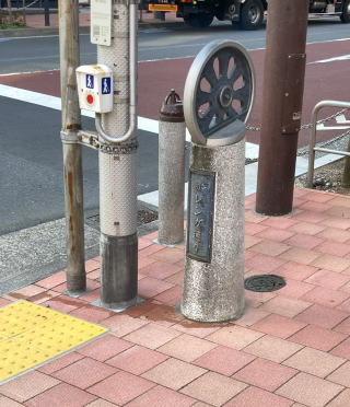 新橋駅から赤レンガ通りを通って会社まで行く途中に道標があります。車輪は鉄道が新橋起点だったためと思います