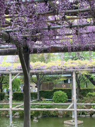 関東にはいくつかの藤の名所があるのですが、近くの亀戸天神の藤の花を見に行ってきました。平日にもかかわらず、結構人が出ていました。心字池にかかる赤い橋の上には人だかりで、橋の上から写真を撮っています。ここの藤は、いくつかの株に分かれていて池を取り囲むように配置されていました。