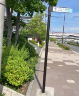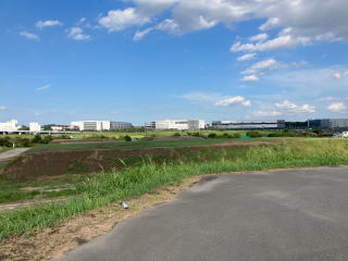ヨドバシの倉庫の裏。多摩川ふれあいロードの起点(道路案内上はスカイブリッジの下が起点)