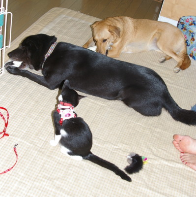 寒くなってきたのでストーブを出したら、ラブがストーブで温まっています。そこへ、小豆がやってきて、2匹で遊んでいます。と言うより、小豆がちょっか