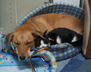 | ついさっきまでは、小豆の引っかき攻撃とマリー頭突き攻撃の応酬だったのに、静かになったと思ったら、二人で一緒のベッドで寝ています。