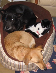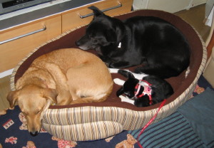 大きなベッドの中で大きなベッドの中で寝ています。はじめはラブとマリーのためのベッドだったのですが、そのうち小豆も入ってきて、3匹仲良くベッドの中に入っています。