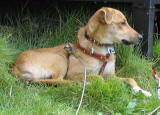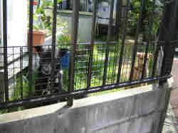 | ラブ姉さんと庭からストリートウォッチングをして います。小さな網が合って見にくいでしょう?実は、私の脱走防止用のネットです。 |  |
