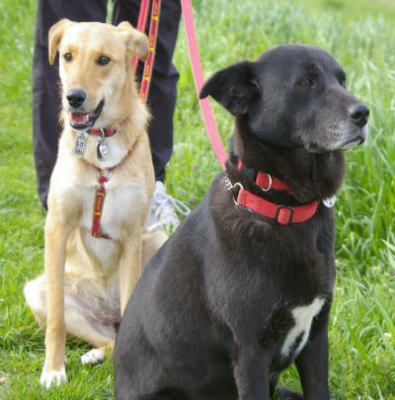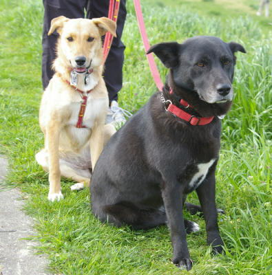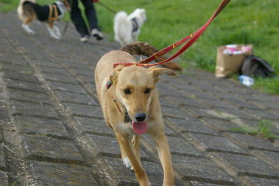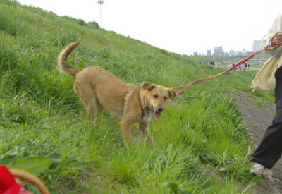 マリーはすっかりハイテンション。一休みのラブを尻目に、あっちで挨拶、こっちでも挨拶。土手の上から降りて、速くみんなのところへ行きたいよー。