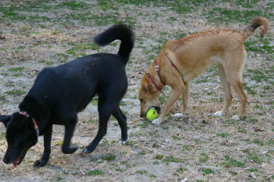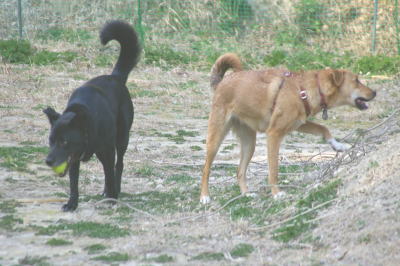 マリー:「ねーちゃんからボールを取り返したぞ。そら、お母さんのところに持っていかなくっちゃ。」と、後ろを見るとラブは追いかけてきません。 マリーは、ボールをラブのところに持っていって、「遊ぼうよ!」