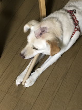 ↑Noriさんちにも慣れていたずらの本領発揮です。テニスボールで遊んでいるうちに表面が外れてしまいました。
